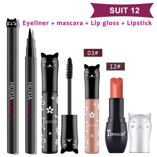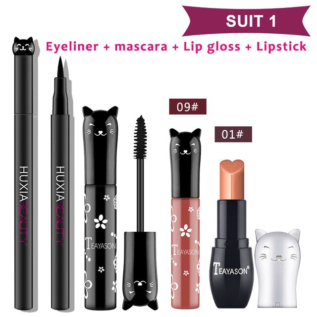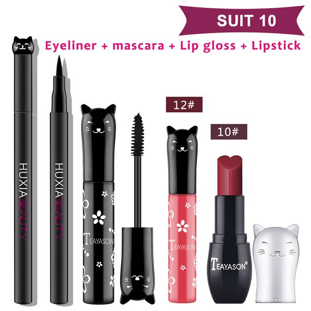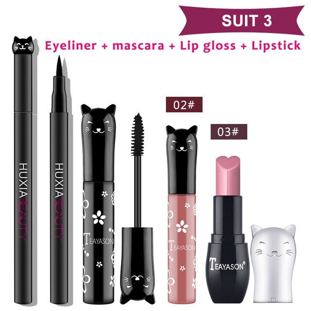 Beauty Makeup Sets Cat Style Long Lasting Matte Lipstick Moisture Lip Gloss Long Thick Black Mascara Eyeliner Cosmetics